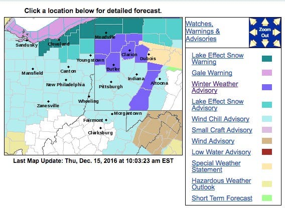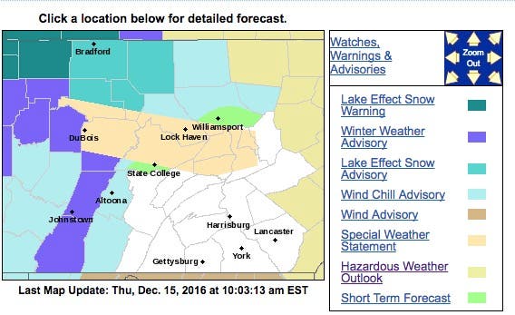 The National Weather Service issued a hazardous weather outlook for eastern Pennsylvania. Winter weather advisories have been reported for parts of central Pennsylvania and western Pennsylvania, and a wind chill advisory is in effect for the Pittsburgh area.