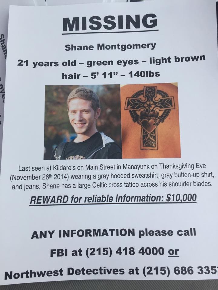 Shane Montgomery, 21, did not return home after spending Thanksgiving Eve out with friends at Kildare’s Pub on Main Street in Manayunk. The Roxborough resident and West Chester College student was last seen around 1:45 a.m. Thursday, when he was escorted out of the bar by a bouncer after he bumped into a stool. The FBI is now involved in the search, which is in its fifth day.