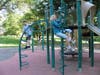 The two play sets feature the standard 2-5 year old equipment in one area and 5-12 year old equipment in the other. The set for the younger kids features several ways to climb up, and two slides to go down. It’s nice because once the kids climb up, I don’t have to worry about them falling off as the only gaps in the fencing is where the ladders and slides start. Of course, my kids like the larger play set where I feel like I have to stay right underneath them because I’m afraid they (especially Thing Two who I swear is part monkey) won’t be paying attention and will fall off. It’s not that the equipment is particularly dangerous, but it’s higher and I’m deathly afraid of freak accidents. Since the equipment is higher the slide is taller so that provides the boys with a great ride. My two-year-old can’t quite climb up the ladder by himself, but the four-year-old has no problem. There are also monkey bars and a great sliding pole that has a spiral around it. My kids are two young for that, but we watched another young girl spin down and it looked really cool. Both play sets sit on a cushioned surface.