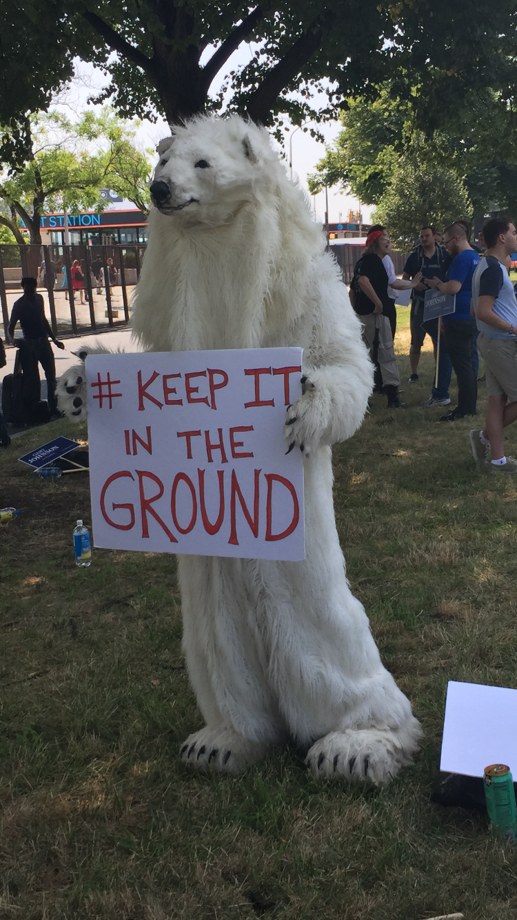 1:18 p.m. The air shimmered with heat on Broad Street. Fans sprayed cool mist out into the streets. Protesters and police alike stood by huge stacks of bottled water which they handed to passersby. In the midst of the seething and sweating midday crowd stood a man in a meticulously detailed polar bear suit.