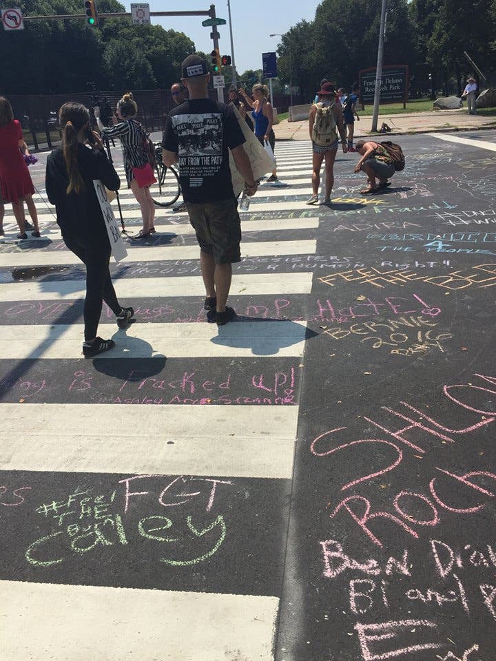 2:13 p.m. In the walkway across Pattison Avenue at Broad Street, protesters are handing out pieces of sidewalk chalk to decorate the streets with multicolored mini memoirs of demonstration.
