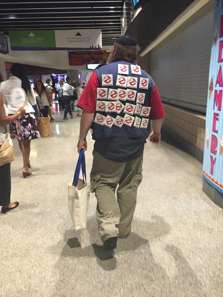 Another man was covered in Ghostbusters-style pins which read "Trump-Busters," and featured an image of an orange-haired ghost-likeness of the Republican nominee.