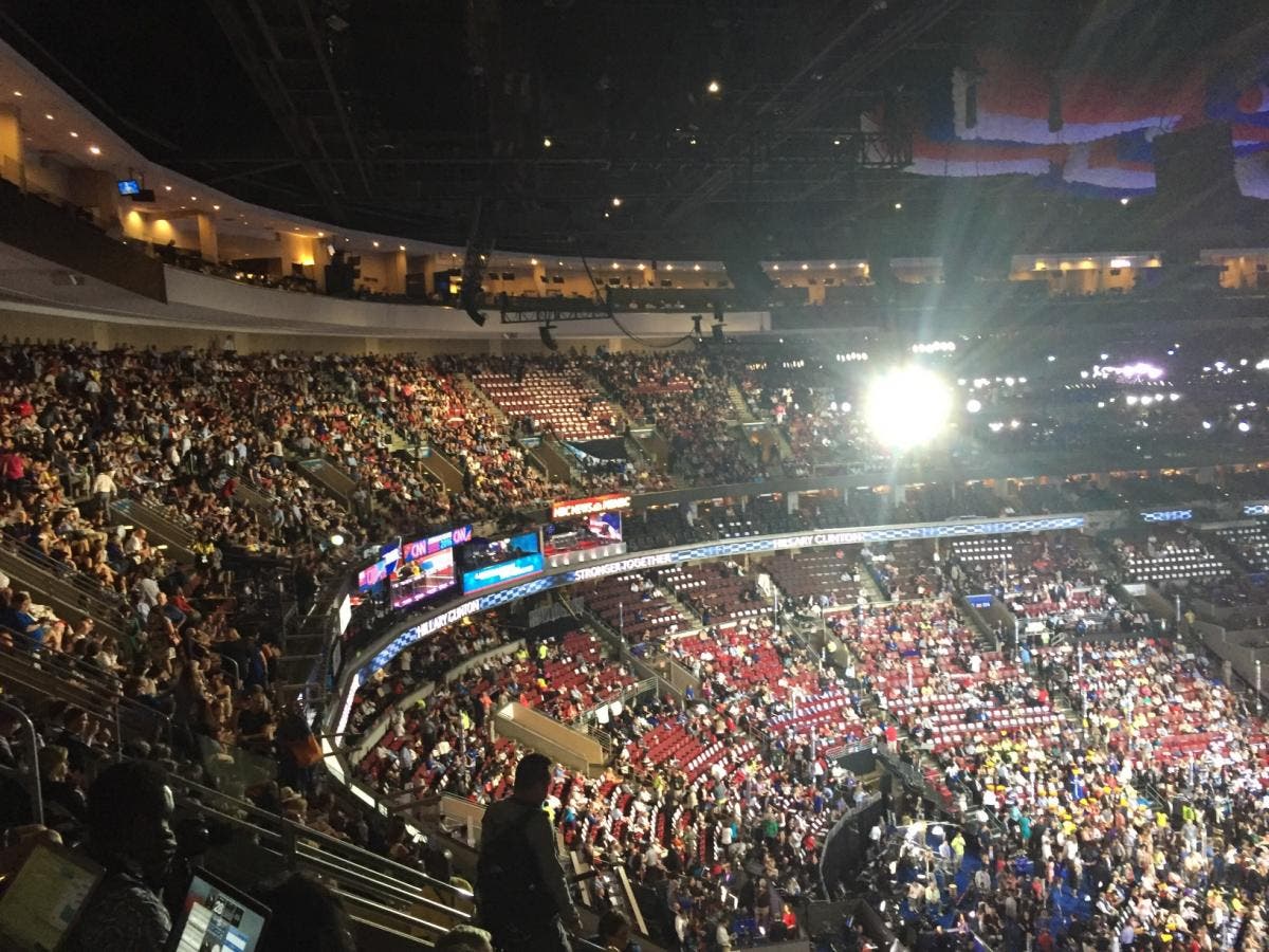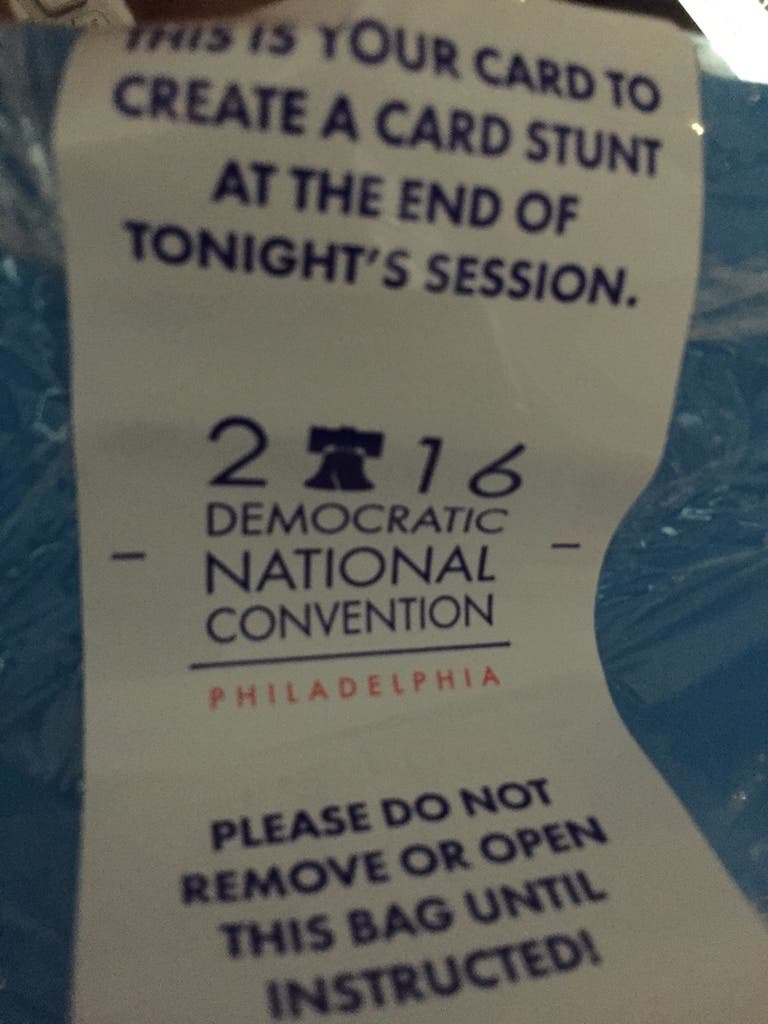 5:28 p.m. Each seat inside the arena has a small blue poster taped to the armrest. A public announcement asked everyone not to remove the poster until the conclusion of Clinton's speech, when each card would be used to create a "card stunt." Each card is apparently unique to each seat.