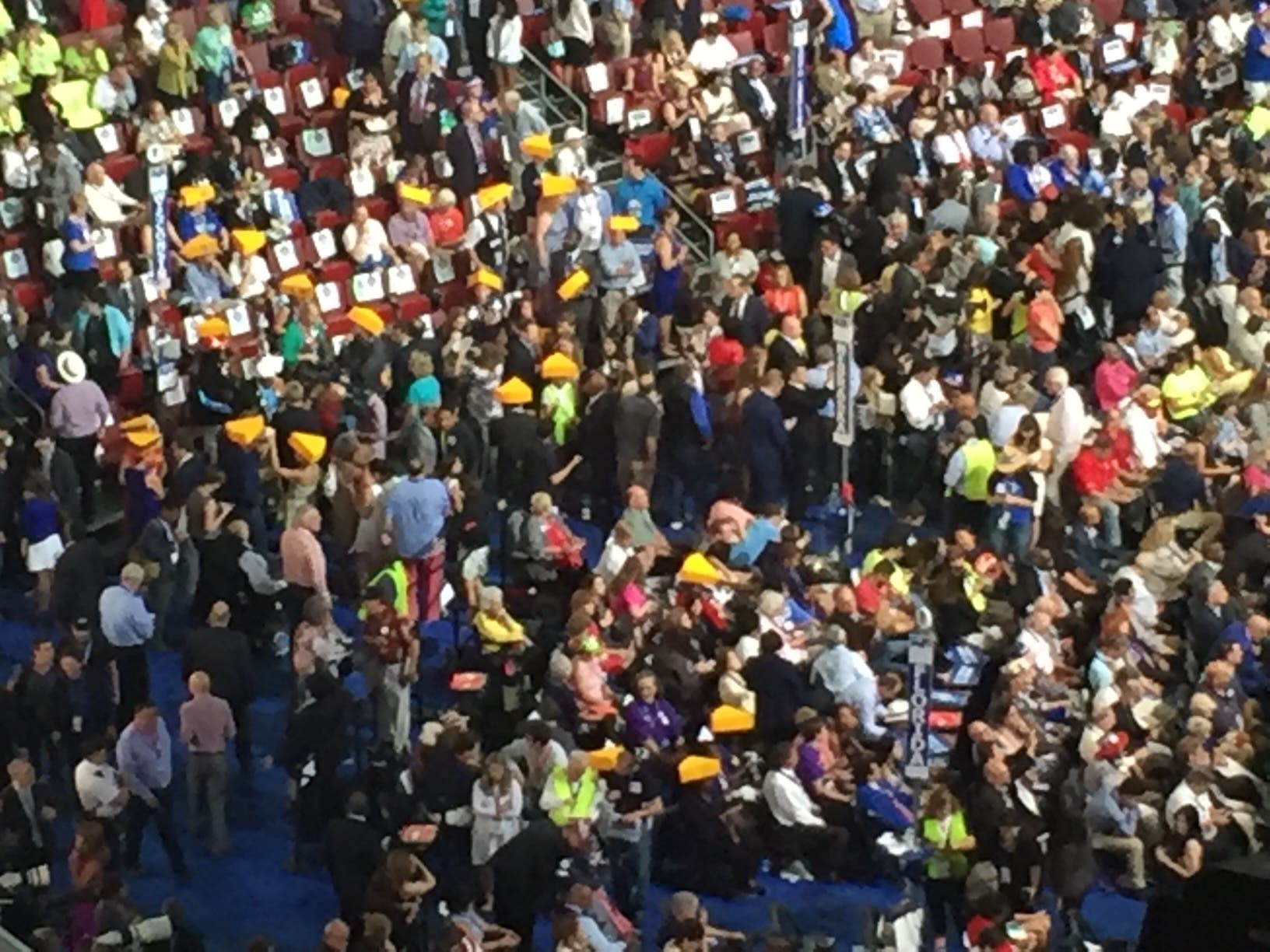 5:31 p.m. The Wisconsin delegation stands out on the convention floor: many of them are wearing cheeseheads, in the iconic style of Green Bay Packers fans.