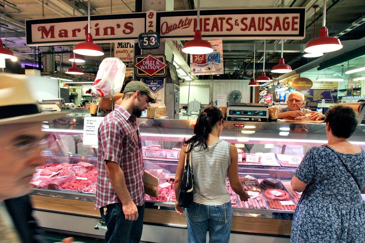 Customers line up for meat and sausage inside Philadelphia's Reading Terminal Market on Tuesday, July 17, 2007. (AP Photo/George Widman)