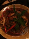 We began with the fried soft shell crab appetizer with cucumber salad, calamari salad and the grilled beef salad with Thai herbs. The soft shell crabs were expertly fried with no hint of greasiness, crisp and shattering upon impact, the shell revealed succulent and sweet crab meat inside. The cucumber salad was lightly dressed with lime juice, fish sauce and sugar and provided a cool acidic bite.