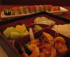 I ordered the shrimp teriyaki version of the Bento Box lunch special. The grilled shrimp were very tender and flavorful, served on a bed of limp onions and sweet soy teriyaki sauce. Other compartments of the square box contained steamed rice, fresh fruit and California rolls, bits of crab, avocado and cucumber encased in rice and seaweed. Served with a savory miso soup and an iceberg lettuce salad under a cool orange house dressing, the bento box lunch was a lot of (healthful) food and a good value for $8.25.