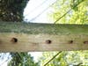 Female carpenter bees make new nests by tunneling into wood. They drill their perfectly round 3/8 inch diameter holes by vibrating their strong flight muscles, and slowly turning their bodies around and around. Their sharp teeth do the drilling, much like a woodworking router. No chewing required! If you look under one of their holes, you might find a pile of sawdust. This is because they do not eat the wood like termites do. The females spend the early summer bringing lots of pollen and nectar to their holes and forming it into little balls, called “bee bread.” This ball of pollen provides a single growing larva with all of the food it needs to grow to adulthood. A female carpenter bee will have about 4-6 larvae, which really isn’t very many for an insect.