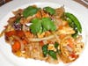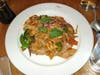 I ordered the popular Drunken Noodles. We were served very quickly and my plate came out good and hot. With chewy egg noodles and tender chicken were a variety of crunchy vegetables: shredded and decoratively cut carrots, broccoli, snow peas, onions, green peppers and a big slice of tomato. The initial first few bites I took were a little bit of a shock because they were very spicy—I forgot to ask for a specific level of spice ranging from one to four, so I guess my plate contained a moderate amount of spice. It burned my mouth a little, but it was very flavorful and also filling with the combination of protein and fiber. I ate about half and took the rest home.