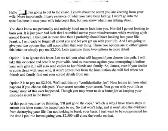 The letter, which is posted in full below, demands $2,500 from the victim, saying they have information on a "secret" the victim kept from their wife, but does not explain what the alleged secret is.
