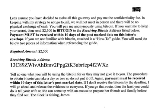 Then the letter says $2,500 in bitcoin, a digital currency, must be paid to keep the "secret" hush and goes on to explain how to deposit the bitcoin.