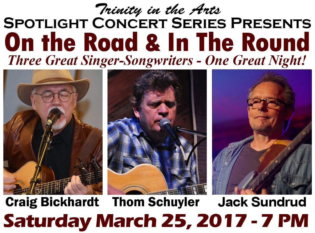 Trinity Presbyterian Church in Berwyn, PA continues their successful Spotlight Concert Series on Saturday, March 25th at 7 PM with On-The-Road & In-The-Round featuring Craig Bickhardt, Thom Schuyler (Nashville Songwriters Hall of Fame), and Jack Sundrud (Poco). These three veteran performing songwriters are from the original Bluebird Cafe writers-in-the-round series that the hit TV series, Nashville, is based upon. The creative sparks that fly between Thom, Craig and Jack during their writing sessions glow even more brightly on the stage. The three of them have a knack for unreeling vignettes and painting miniatures within a pop song structure, displaying a keen eye for the telling lyric detail. Join us in the sanctuary for one special evening of great acoustic music by three highly-acclaimed singer-songwriters. You’ll laugh a lot, cry a little and really be inspired!