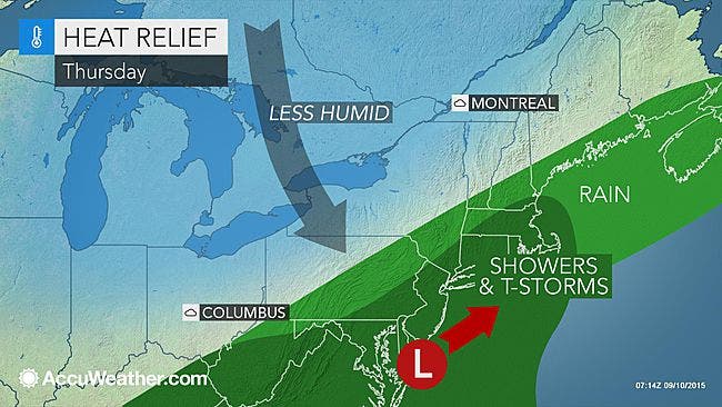 “A strong cold front will impact the Northeast, bringing much-cooler air into the region,” according to AccuWeather Meteorologist Edward Vallee. “Rain and thunderstorms will drench some areas, bringing localized flooding in some low-lying and poor drainage areas.”