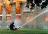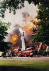 It was not a moment too soon. Seconds later, the super-heated gases inside the massive sanctuary exploded in a flashover that blew all four men out the front door and down the steps. Helmets and air masks went sailing and Firefighters Hildebrand, Johnson and Junod went to the hospital to be checked out, none sustaining serious injuries.