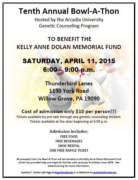The Arcadia Genetic Counseling Program is hosting its 10th annual Bowl-a-thon to benefit the Kelly Anne Dolan Memorial Fund (KADMF) on Saturday, April 11 at the Thunderbird Lanes in Willow Grove. Tickets, available through any genetic counseling student or at the door, are $10 per person and include food, beverages, shoe rental, raffle ticket and bowling.