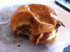 All of the ingredients masked the burger a little, but it was a delicious sandwich, even if it was heart attack fodder. The roll, with a potato bread-soft yellow interior and challah egg-glazed exterior, was the perfect vehicle to contain all the toppings.