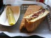 The Pastrami Panini ($5.50) was described on the wall menu board as pastrami, cheese, spicy mustard and pickles, but at the last minute, Flori convinced me that it would be better with coleslaw in the sandwich, and pickles on the side. She was right, of course, as the coleslaw added some moisture to the hearty meat and zippy mustard. Upgrade!
