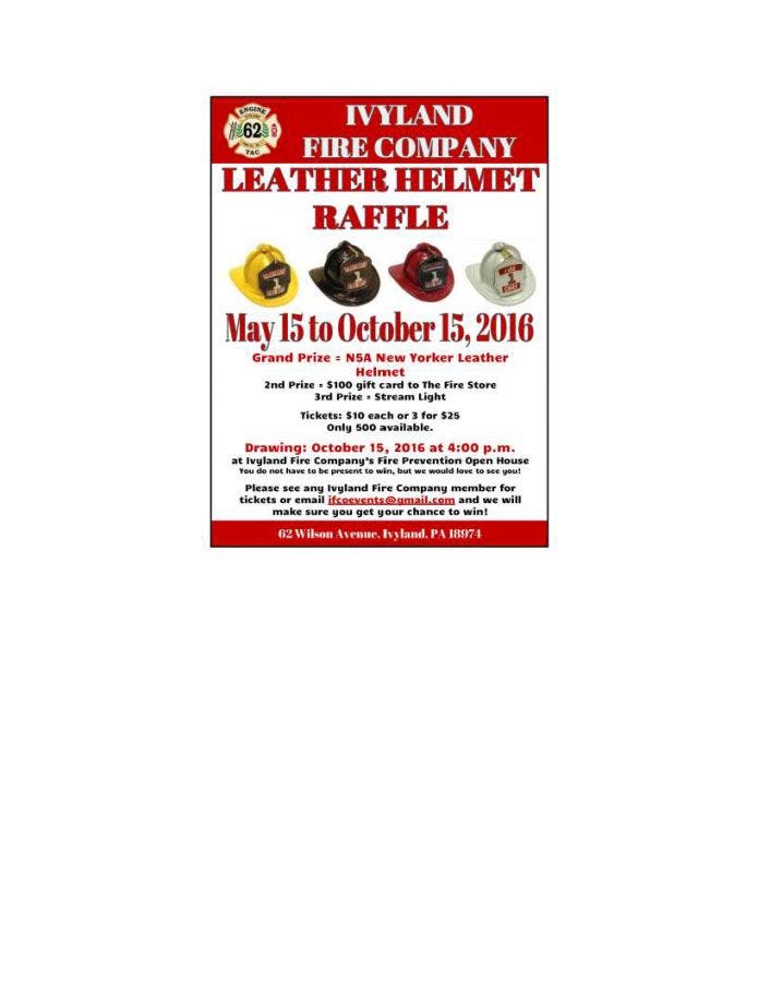 Raffle tickets are on sale from now until Ivyland Fire Company's Fire Prevention Open House being held on October 15, 2016, at Milton Roy, Accudyne, at 201 Ivyland Road, Warminster, PA 18974. The drawing will take place at 4 p.m.