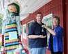 Shown in photo: Todd Bozes, new manager of NOVA Thrift Shop, accepts the keys to the shop from Karen Corbett. At the left is the thrift shop’s mascot, whose sign reads: I’m a NOVA Thrift Shop Diva. Come shop with me!