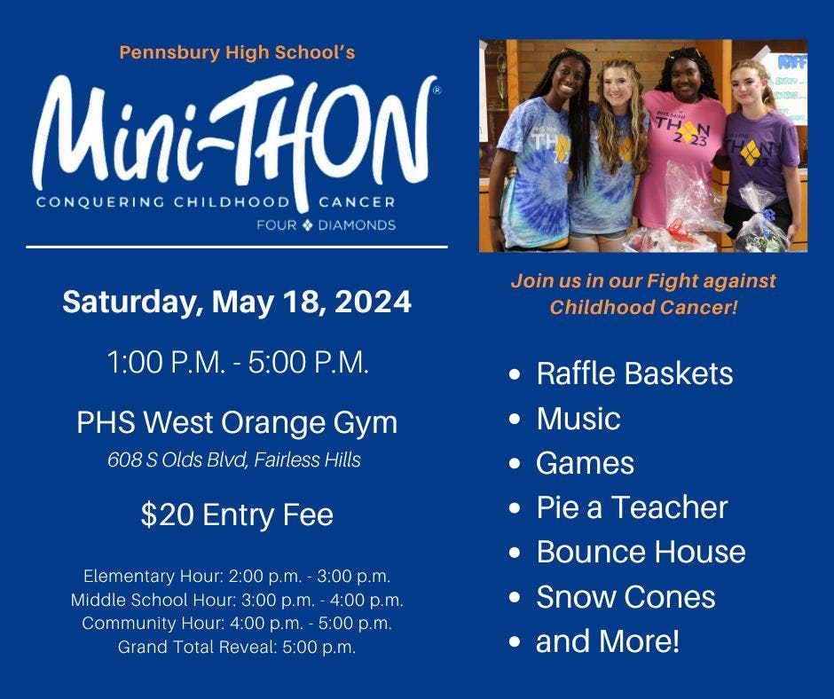 This Saturday is Pennsbury High School's Annual Mini-THON event to fight against childhood cancer. The event takes place from 1-5 p.m. in the Pennsbury High School West Orange Gym (608 S Olds Blvd, Fairless Hills). There is a $20 entry fee and people can also click here to donate to the cause. The Four Diamonds Mini-THON® empowers K-12 students to raise funds and awareness to help conquer childhood cancer. Mini-THONs raise money for cancer care and research while having fun and learning work-ready skills.