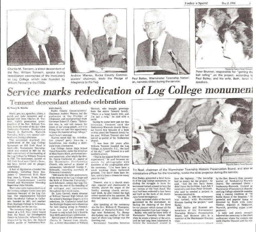 • Coordinated the turning of Log College Monument to face York Road.