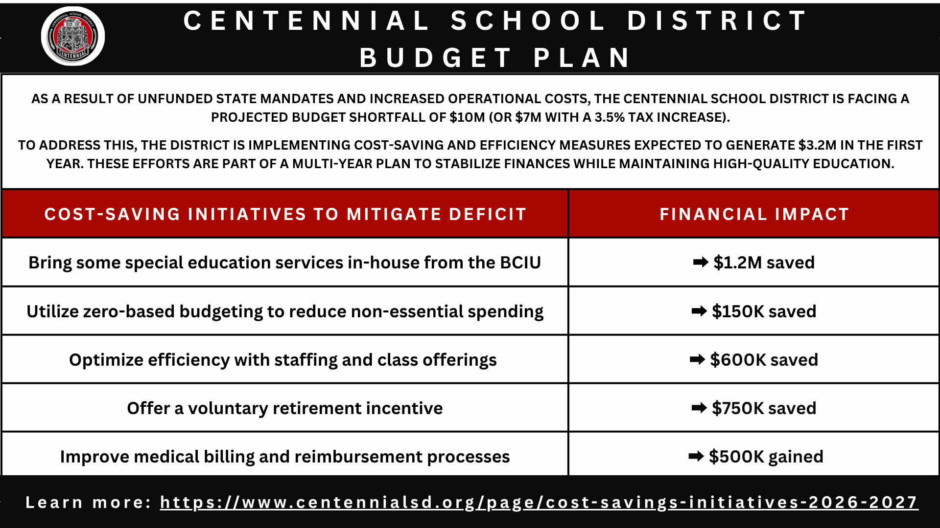 WARMINSTER TOWNSHIP, PA — Faced with an estimated deficit of $10 million in the 2026-2027 budget, the Centennial School District is outlining a cost-saving plan.