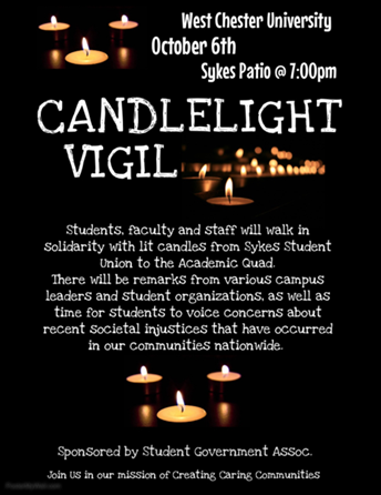 WEST CHESTER, PA -- West Chester University's student government will host a candlelight vigil for solidarity in the wake of recent social injustices around the nation, they announced.