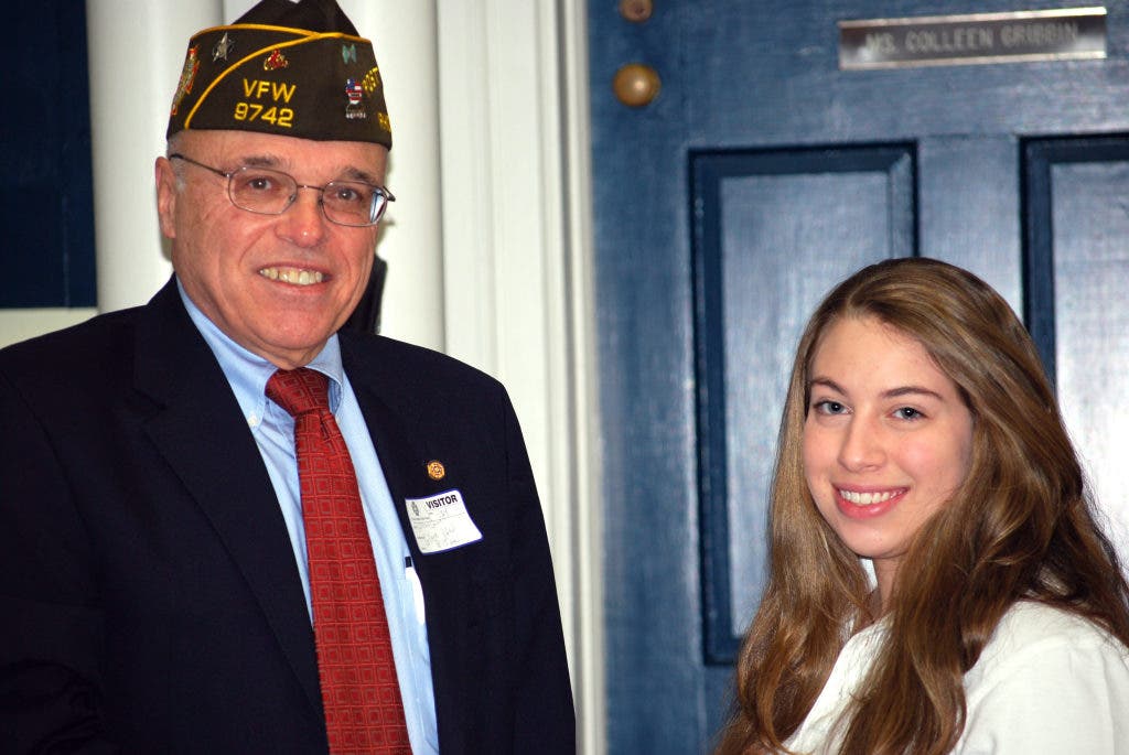 Cristina Marsocci received the $100 prize from William Grove, commander of the VFW Post, for an essay she wrote and recorded as a broadcast script. It was titled “4400 Words That Changed the World.”