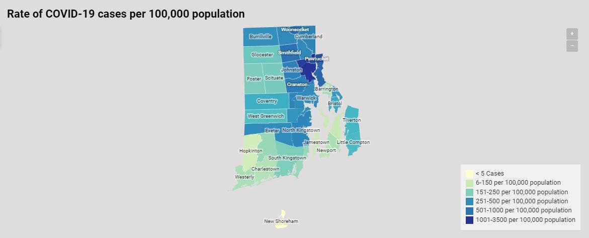 A map created by the department shows that the highest per capita infection rates are centered around the Providence area, with considerably lower rates in the western half of the state, particularly the southwestern corner, as well as the East Bay.