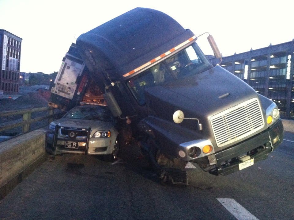 After hitting the crash truck, she veered to the left, hitting the side of a tractor trailer that overturned and landed partially on a state police cruiser.