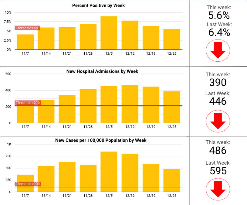 As of Monday, Rhode Island's daily percent positivity was 7.3 percent, well above the safe threshold of 5 percent. Last week, the weekly percent positive rate was 5.3 percent, the lowest it's been since the week of Nov. 7. Hospitalizations and cases per 100,000 people declined week-to-week, as well.