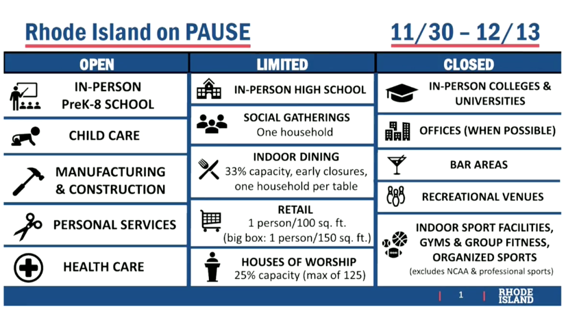 The pause is part of the state's pathway to the end of the year, aimed at keeping the state's hospitals from becoming overwhelmed before a vaccine is widely available, Raimondo said. Although there is "light at the end of the tunnel," the governor said she expected the coming six weeks to be the worst yet.