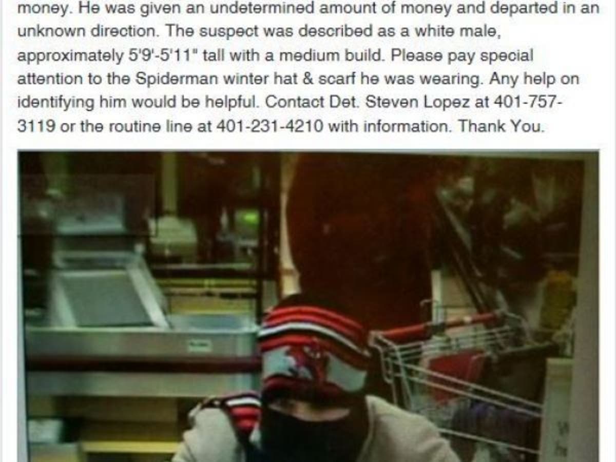 The press release continued to say "a supermarket employee told responding Johnston Police officers that he saw a person who looked out of place on the other side of a fence adjoining the supermarket parking lot. Officers searched the area and located a black face mask, and a Spiderman hat and scarf. A beige jacket was located in the parking lot. Inside the jacket, officers located a note that said, “Robbery $100 and $50 Stacks only No die pack No Alarm. have A gun will use.” An outer pocket contained a stack of $20 bills."