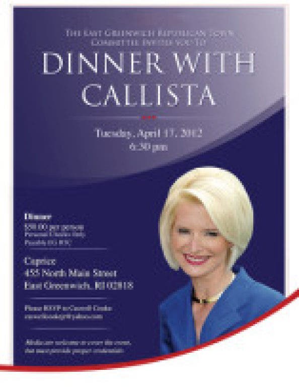 Callista Gingrich In East Greenwich: The public is invited to a dinner for Callista Gingrich, wife of presidential candidate Newt Gingrich, at on Main Street at 6:30 p.m. It costs $50 per person. RSVP to caswellcookejr@yahoo.com.