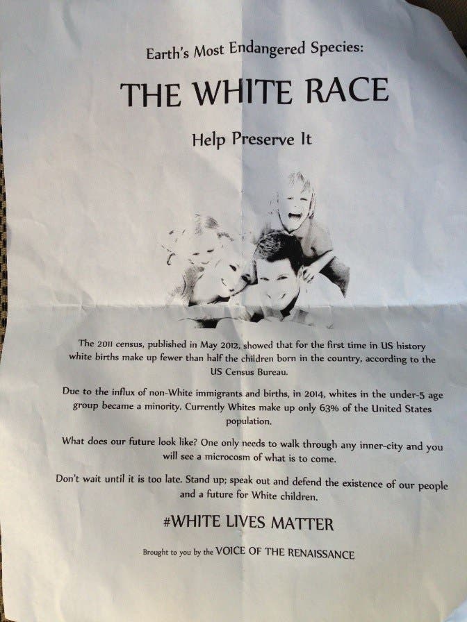 The flyers stated that the white race is “Earth’s Most Endangered Species,” and said “stand up, speak out and defend the existence of our people and a future for white children.”