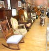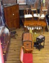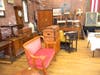 Furniture/Accessories: L & J.G. Stickley morris chair , antique oak optometrist cabinet/desk, Larkin 2 over 4 chest, c.1860 one drawer blanket chest, Empire stand, Larkin sewing table, butcher block table, marble top tables, pedestal base gaming table, bun footed mahogany drop leaf table, claw footed morris chair, chip carved chest, oak bookcase, child’s roll top desk, 2 stacker oak bookcase, mid- century modern teak server, 2 sleigh seats, folk art gun stock table, marble top commode, early 4 door corner cupboard, sofa w/cane back & sides, pair John Stuart end tables, cherry bentwood settee, 7 pc. iron ice cream set, early Oriental marble top plant stand, unusual oak table, mid- century teak table w/8 chairs, Bird’s eye maple paw footed chest, mid- century modern server, pr. Arts & Crafts chairs covered in red leather, early tall clock, carved wood bulls eye mirror w/eagle, embroidery on paper 4 panel screen, oak commode w/modern sink, French Provincial armchair, ornate carved bed,