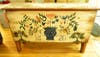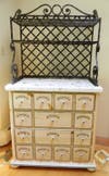 Pine decorated chest , 3 pc. Antique Wicker Set, Marble top Tables, 5 Leg Oak