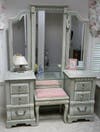 vanity, Crewel embroidered chair & stool, floor lamps, Stromberg Carlson