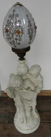 figure inkwell, porcelain mini sconces pair, postcards, linens, Victorian