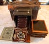inlaid burl wood bridge box, antique fans, vintage comic books, medical