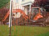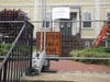The handrails will be re-used, maintaining the building's authenticity. The front entrance on Main Street is temporarily blocked by a wire fence, with signs directing traffic to the rear of the building.