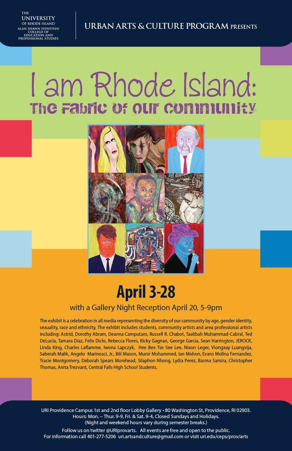 Prof. Angelo Marinosci, Jr. Artist/Photographer and Educator is included in "I AM RHODE ISLAND: The Fabric of our Community" exhibition at U.R.I. ... along with of a host of other well known local artists; like Anita Trezvant; Russell R. Chabot; George Garcia and a host of others... at U.R.I. Providence Campus on 80 on Washington St. 3-28 April with an opening reception on 20 April 5-9PM