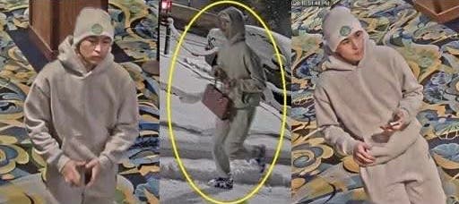 The person pictured in the surveillance stills was wearing a sweatsuit and matching stocking cap, and was holding a woman's handbag.
