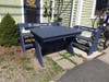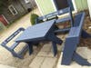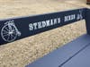 The benches are about 4 feet long and are dark blue with “Steadman’s Bikes” painted across the back.