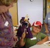Each time a child finished constructing a puppet, Klau held it up and announced, "Ladies and Gentlemen, we have a puppet."