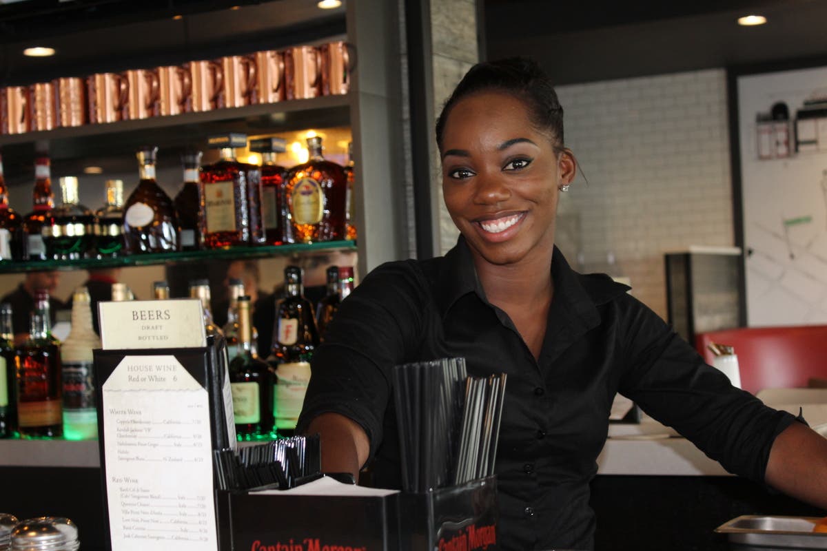 Photo Caption: Alysia Jarmon, of Newport, behind the bar at Antonio's. The restaurant has a full liquor license, and may well become known, like Antonio's near UMass Amherst, for their martinis.