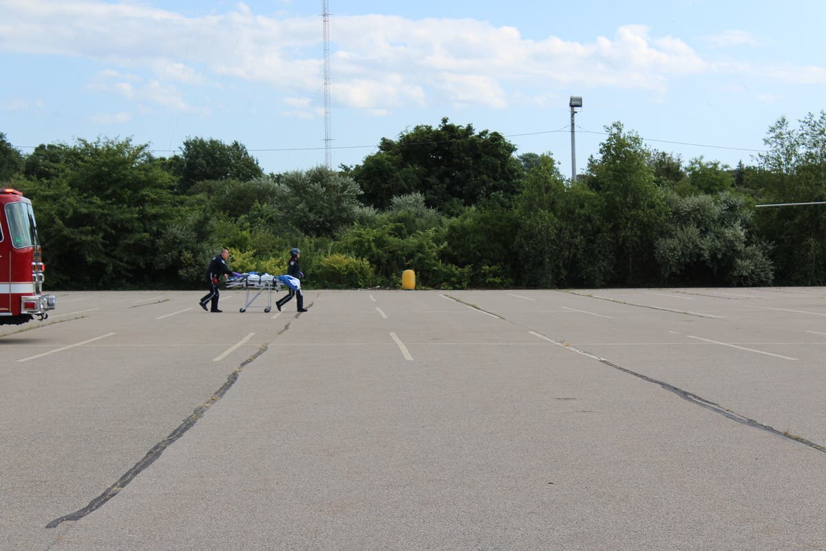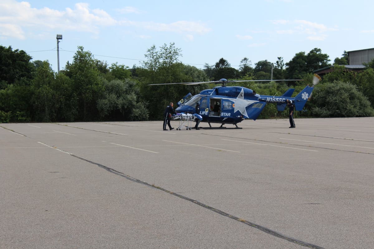 Firefighters wheel injured boy to a helicopter at Newport Grand