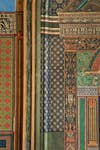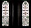 At United Congregational, La Farge drew from his familiarity with medieval church architecture to create a decorative program suggestive of the green marble of Lombardy churches combined with Romanesque and Byzantine ornament. Seeking to draw attention away from the furnishings and coloration of the ground floor, he added no wall decoration along the aisles below the galleries. He intended that worshipers' eyes would be drawn upward to richer ornament, culminating in the remarkably detailed design of the main and gallery ceiling panels, and forward to the shallow arch behind the reading desk. This upper-level mural wraps around the church galleries to the front (east) arch where La Farge painted an elaborate, pedimented design with columns suggestive of a temple entrance (see photographs attached). Through the use of advancing and receding colors illuminated by the carefully controlled light of the opalescent glass windows, La Farge transformed the plain, but generous spaces of this Romanesque church into what architectural historian Ron Onorato has called “a highly elaborate ensemble of color and light.”