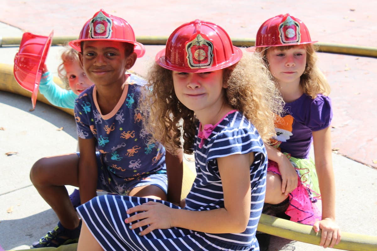 The firefighters gave the children official hats, while they watched the crews mop up.