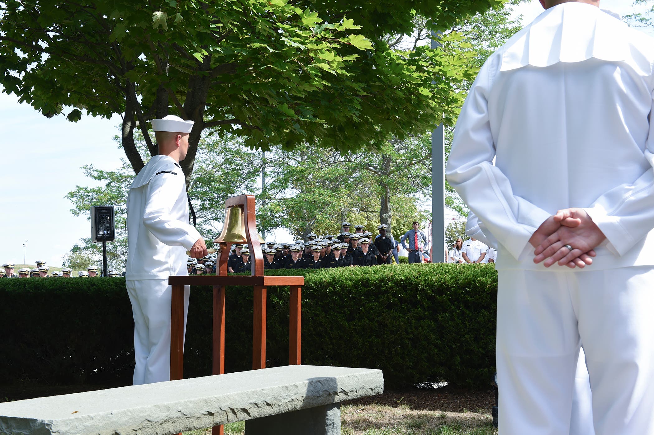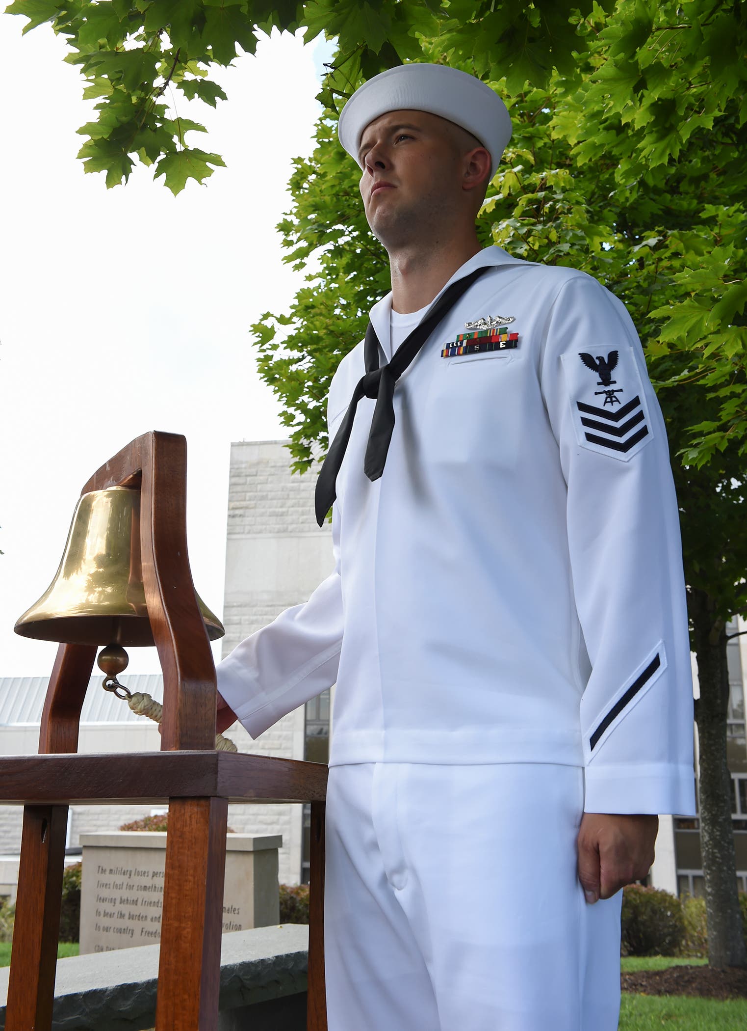 The names of each of the 11 graduates or students —sailors, soldiers and civilians—who died during the attacks 15 years ago were read followed by a short tribute about their lives. Then the chief petty officer selectees rang a bell in remembrance for each one. Finally, the bugler played Taps.